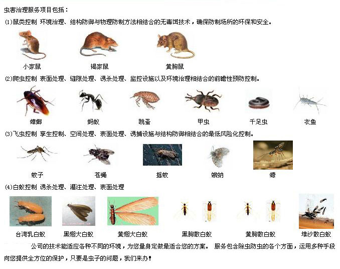 公司主要从事蟑螂、老鼠、蚊子、跳蚤、臭虫、虱子、苍蝇、蜈蚣、等害虫杀灭防治,各酒店、宾馆、工厂、宿舍、花园、住宅小区、超市消毒防治,虫害防治环境治理,绿化养护等工作。